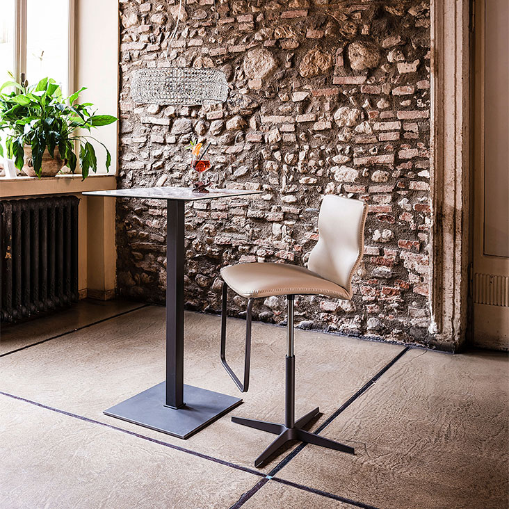 Sgabello ultraleggero regolabile in altezza e girevole con base a 4 razze in alluminio lucido, colonna, poggiapiedi e pistone a gas in acciaio cromato (08) o base, colonna, poggiapiedi verniciati goffrato nero (GFM73) o titanio (GFM11) e pistone a gas in acciaio cromato (08). Scocca in metallo rivestita in tessuto, synthetic nubuck, micro nubuck, ecopelle, o pelle come da campionario. — Il nuovo pistone ribassato consente l’utilizzo dello sgabello come sedia —