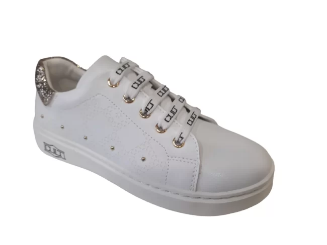 - Sneakers in ecopelle bianca con lacci e glitter e sottopiede in pelle. L’articolo ha la suola in gomma alta 2 cm.