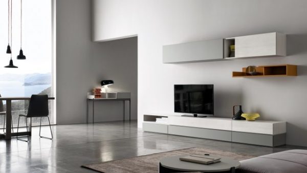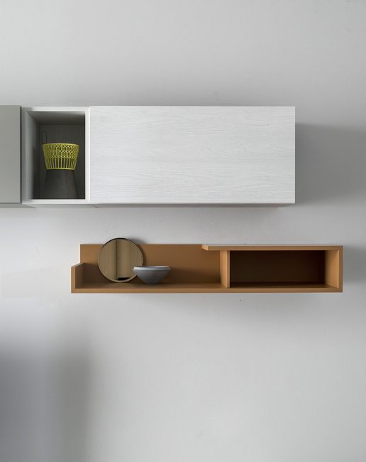 - Un living caratterizzato da diversi elementi come vani a giorno dal tono acceso, pensili in essenza e altri complementi tutti da scoprire.