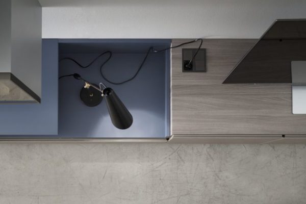 Le venature dell’essenza si affiancano al laccato opaco Basalto, per un insieme materico e cromatico che invita al relax in soggiorno.