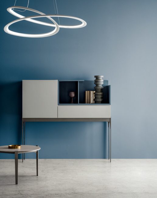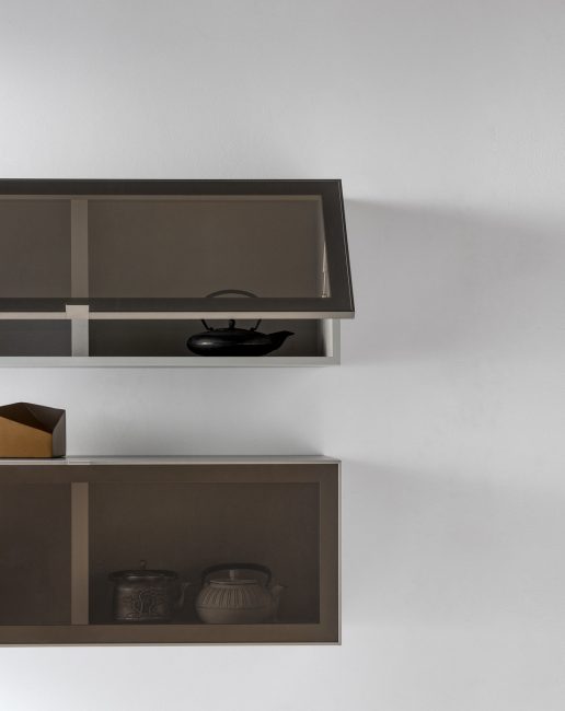 Close up sui moduli sospesi: l’effetto vedo non vedo dato dalla finitura in vetro fumè dà un tocco dal carattere seducente.
