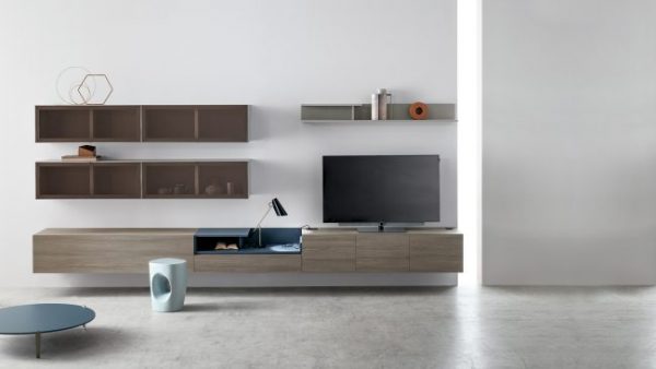 - Pensili con frontali in vetro, vani a giorno e una base sospesa per questo soggiorno ricco di dettagli dal design razionalmente innovativo.