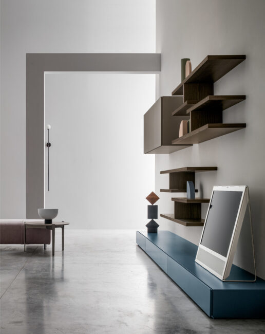 Come linee prospettiche, gli arredi marcano la traiettoria del soggiorno. Il laccato opaco Basalto accostato al Matwood Dark delle mensole e all’Eco Pepe dei moduli crea un insieme cromatico armonioso e rilassante.