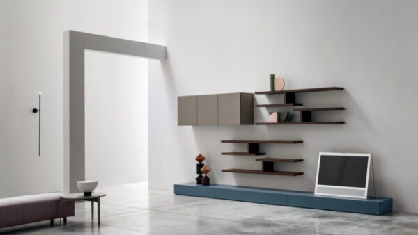 - Tante finiture, colori ed effetti grafici per questo soggiorno composto da una base a terra, mensole e moduli: lineare in apparenza, Innovativo nella sostanza.