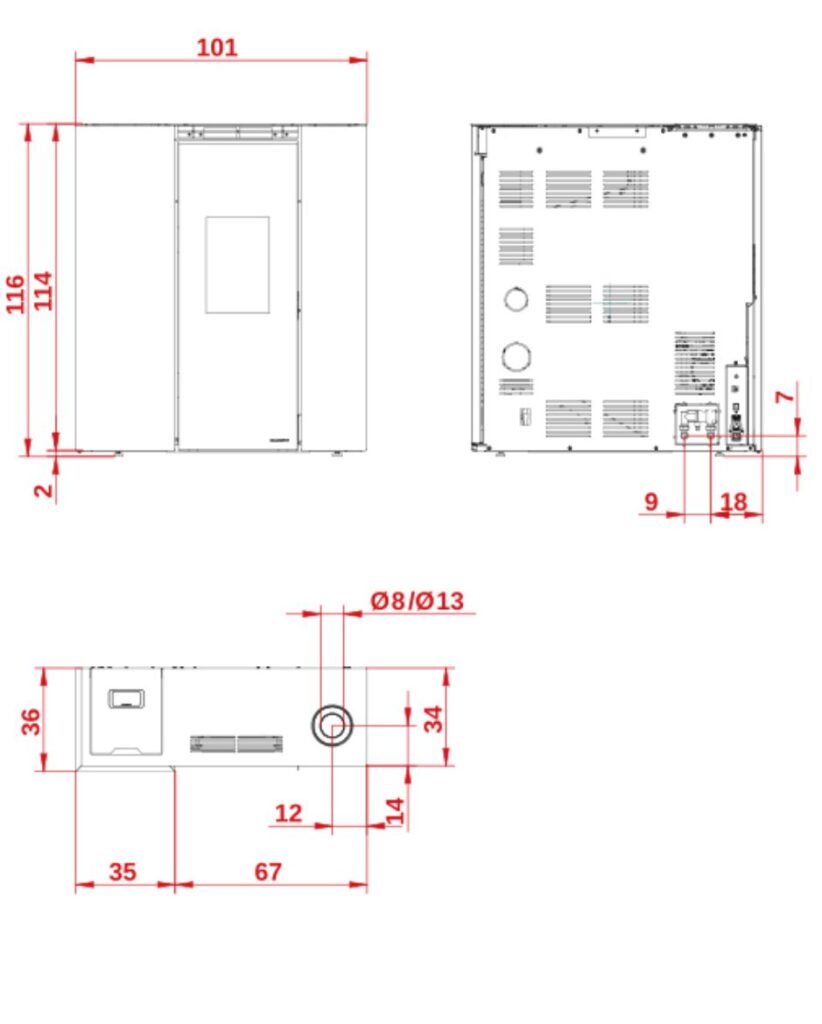 - • predisposta per l’uscita fumi e la ripresa dell’aria coassiale superiore, integrata nella geometria della stufa
