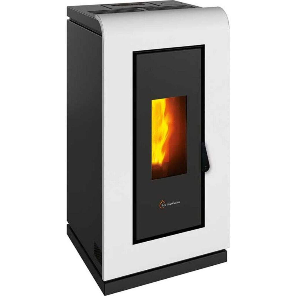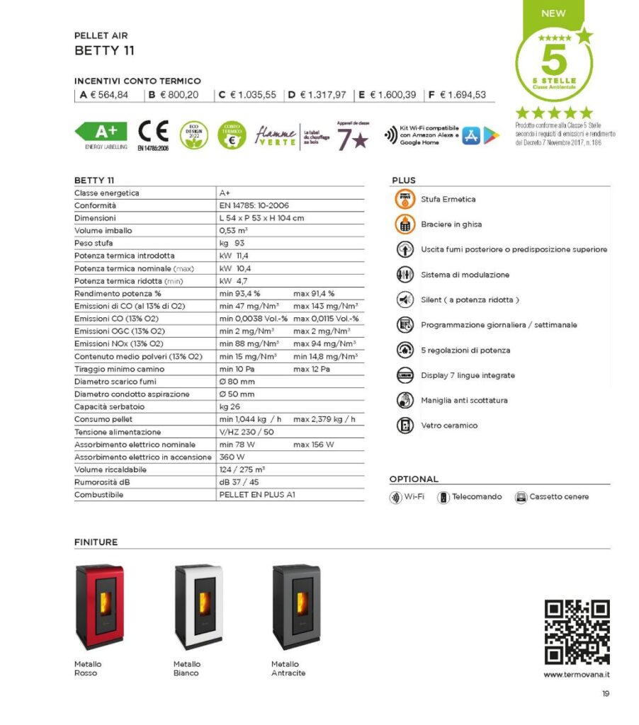 - Stufa a pellet Betty 11 kW Termovana Classe A+, uscita fumi posteriore o superiore, riscalda fino a 90 mq circa, braciere in ghisa, maniglia antiscottatura.