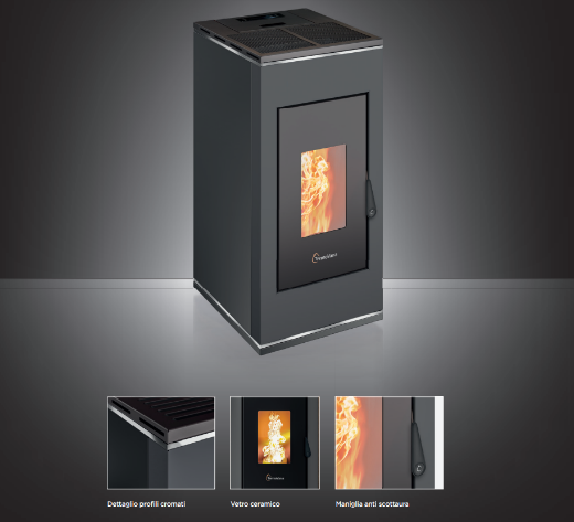 - STUFA A PELLET TERMOVANA MODELLO SOFIA 9.0KW CON MANIGLIA ANTI SCOTTATURA, VETRO CERAMICO E DETTAGLI PROFILI CROMATI.