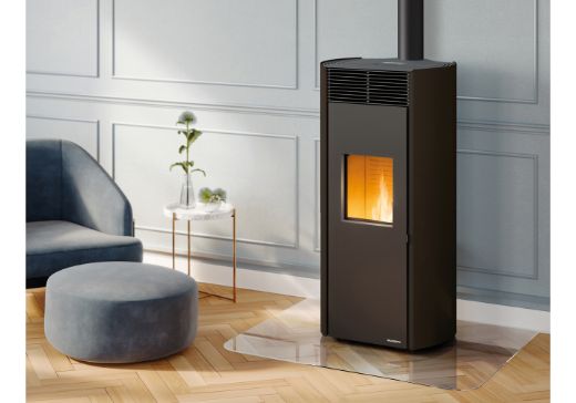 - Stufa a pellet ermetica in acciaio verniciato con fianchi arrotondati.