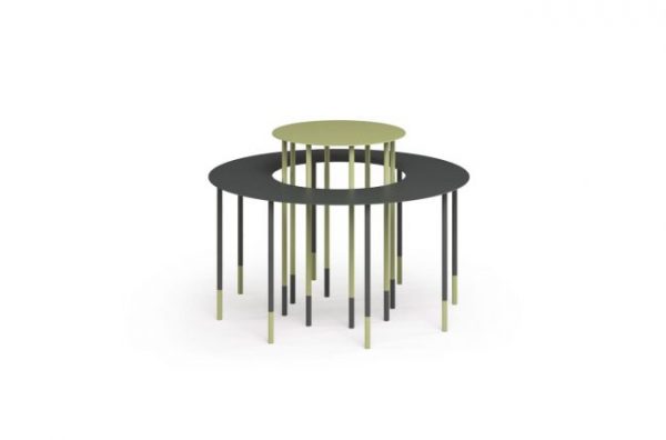È disponibile in tinta unita o con piedini a contrasto ed è possibile giocare con i colori tra il tavolino esterno e quello interno.