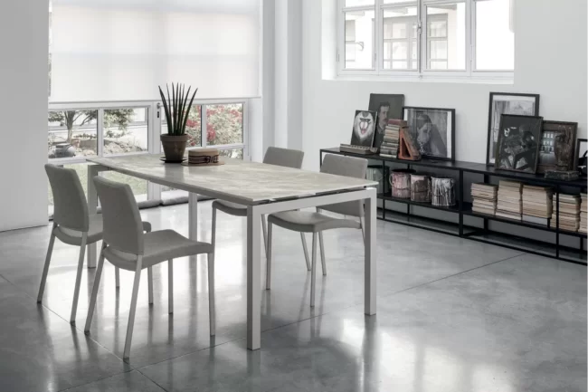 Tavolo allungabile con struttura in metallo verniciato, piano ed allunga laterale in gres porcellanato o vetro temperato.