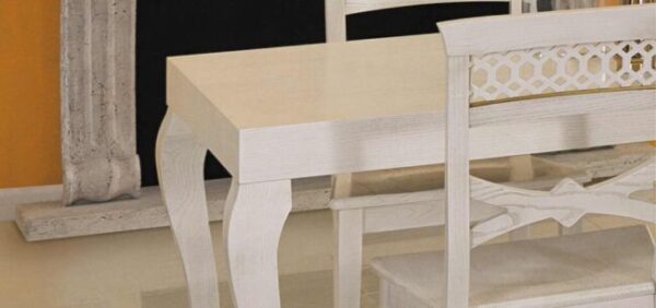 - Tavolo da pranzo bianco con sedie in stile classico e dettagli raffinati.