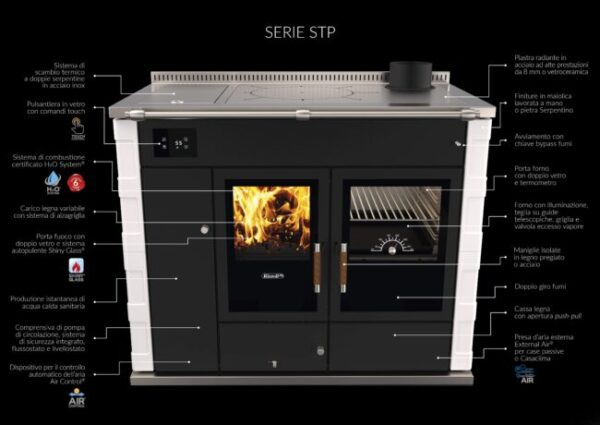 - La termocucina STP è dotata di serie di numerosi componenti impiantistici tra cui pompa di circolazione, centralina elettronica di controllo, sistema di sicurezza integrato, livellostato, flussostato e doppie serpentine in acciaio inox. Il tutto è controllabile attraverso la nuovissima pulsantiera in vetro con comandi touch. All’interno è sempre presente il sistema di combustione