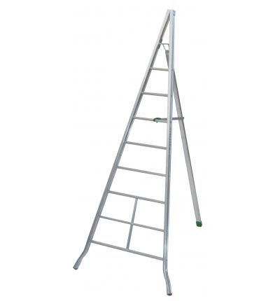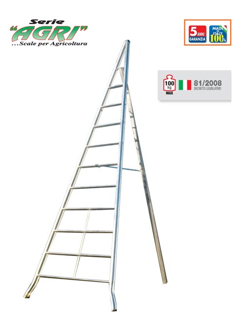 AGRI è scala in alluminio specifica per uso agricolo, per la manutenzione di piante e siepi oltre che la raccolta di frutta. I gradini a trapezio inclinato favoriscono le lunghe soste dei piedi che appoggiano in piano e non stancano le gambe, sono passanti al montante, ribordati e saldati per massima sicurezza strutturale. Montanti tubolari nervati 30×65 mm. Telaio di salita ampiamente conico per la totale stabilità anche su terreni sconnessi. La scala termina a punta in alto per infilarsi nei rami. Caratteristiche: AG250 Gradini: 6 Altezza verticale: 250 cm Larghezza: 98 cm Altezza massima di lavoro: 350 cm Peso: 5,70 Kg