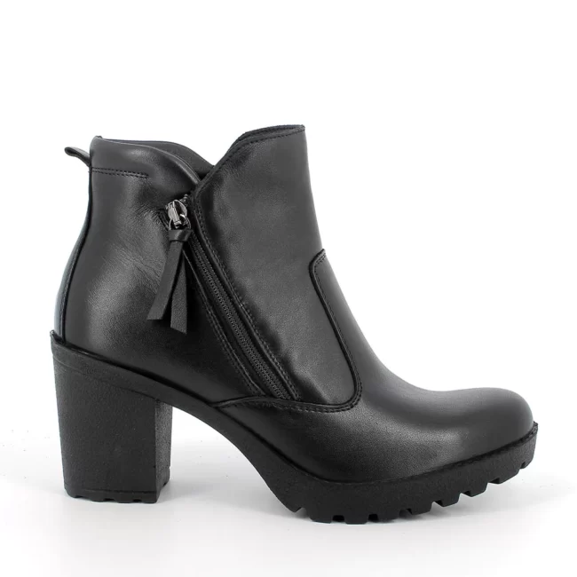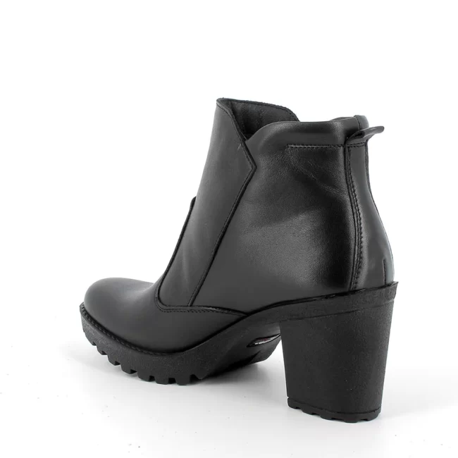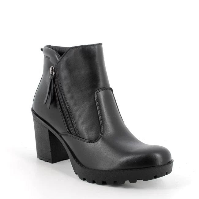 Tronchetti per Donna Igi&Co realizzati in pelle colore nero con allaccio tramite lampo lato esterno. Fodera in tessuto nero, sottopiede estraibile in pelle nero, fondo roccia in gomma nero con tacco 8cm e plateau 2,5cm.